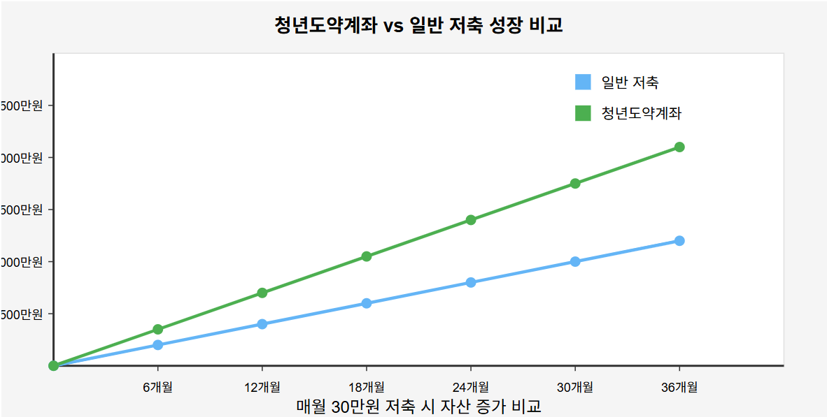 - 정부 지원금: 매월 저축액의 최대 30% 추가 지원
